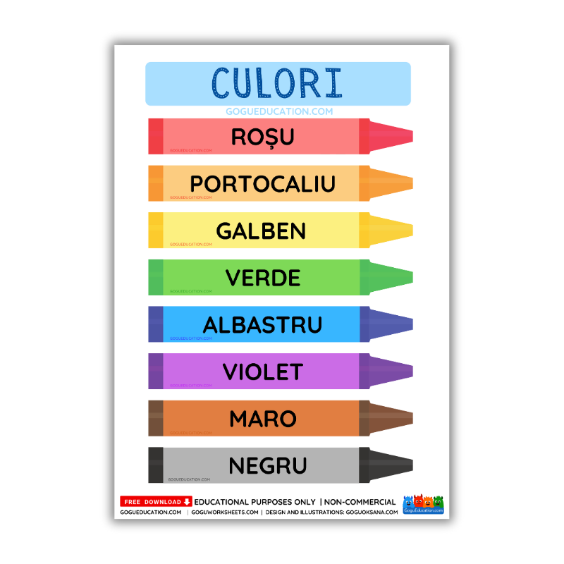 Standard Vocabulary: Uses common Romanian color names suitable for beginners.