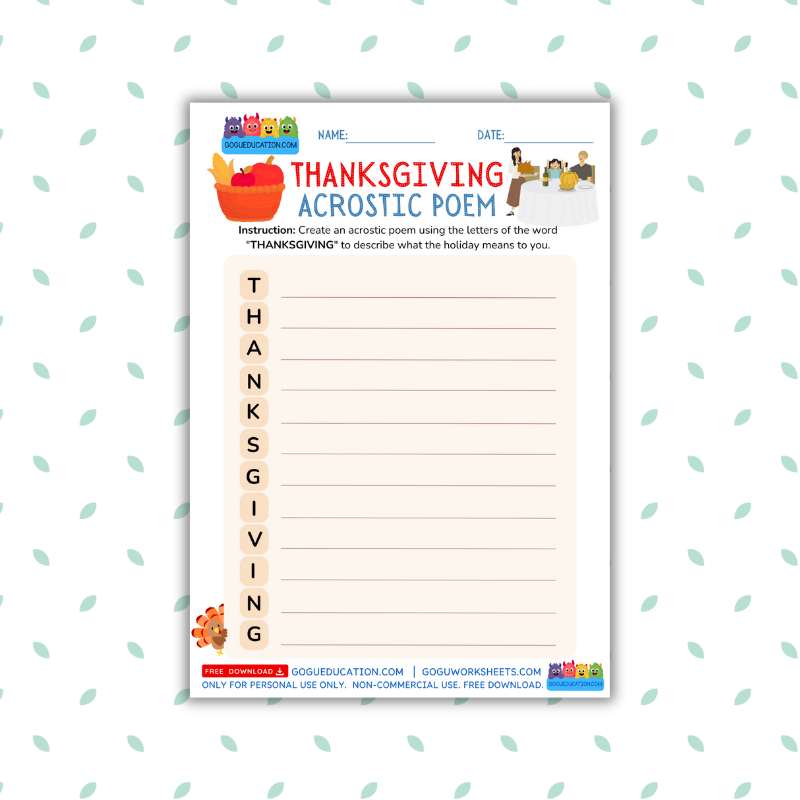 Celebrate the spirit of gratitude with this fun and creative Thanksgiving Acrostic Poem Worksheet from Gogu Education! Children can use the letters in the word “THANKSGIVING” to write their own special poem, expressing what the holiday means to them. Perfect for elementary students, this printable worksheet encourages creative writing, vocabulary development, and reflection on the values of thankfulness and family. Ideal for classrooms, homeschool activities, or Thanksgiving morning lessons, it’s beautifully designed with warm festive colors and illustrations.