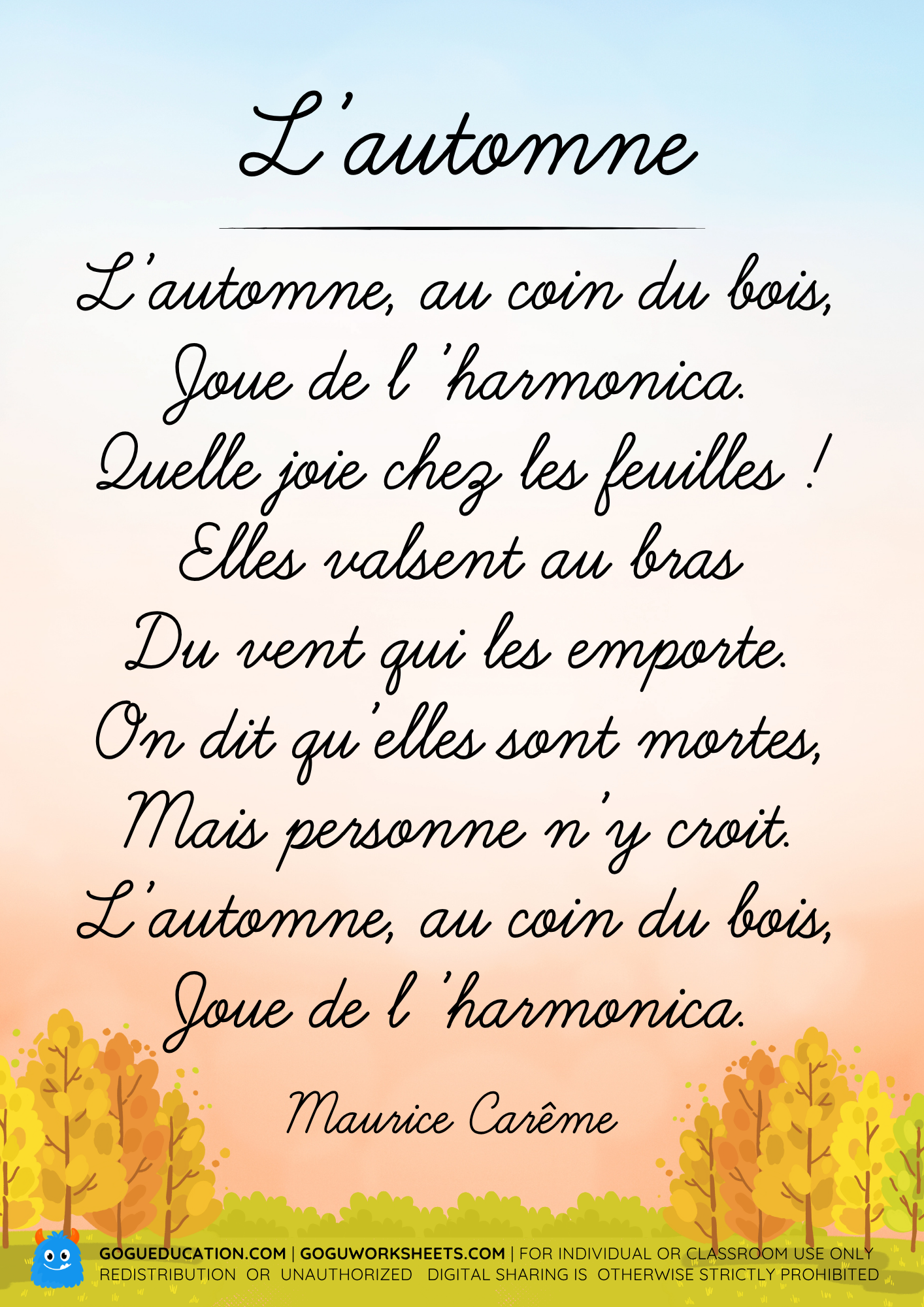 Introduce students to French poetry with this beautifully illustrated poster of "L'automne" by Maurice Carême. A perfect seasonal resource for practicing pronunciation and learning autumn-themed vocabulary.
